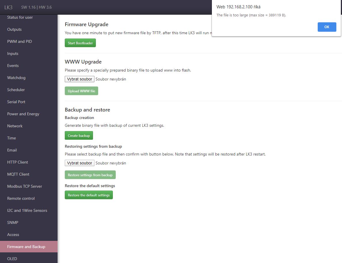 RE: LK3.5-NOWY SOFT - KOLEJNE WERSJE - wydrys - 03-19-2020 Hi i have LK 3.6 - frist firmware update from ver. 1.10 to 1.16 no problem now i want update firmware to 1.22c and always problem " File is to large " what is wrong ... thanks guys .. ok my bad now i use TFTPD32