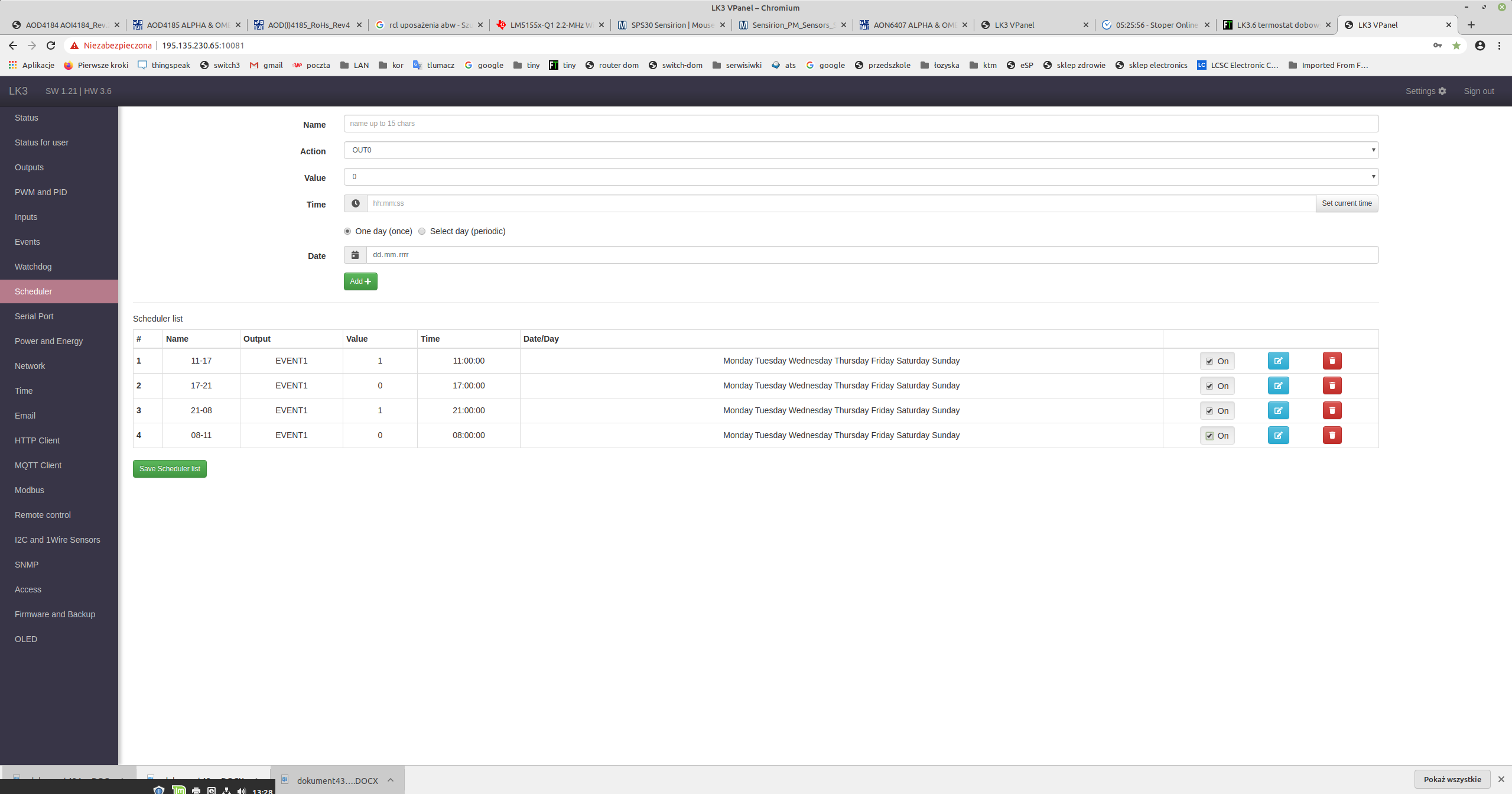 LK3.6 termostat dobowy - Wersja do druku +- Forum tinycontrol (https://forum.tinycontrol.pl) +-- Dział: LanKontroler - sprzęt i wersje wsadów, problemy, zastosowanie (https://forum.tinycontrol.pl/forumdisplay.php?fid=3) +--- Dział: LanKontroler V3.5 (https://forum.tinycontrol.pl/forumdisplay.php?fid=28) +--- Wątek: LK3.6 termostat dobowy (/showthread.php?tid=1019) Strony: