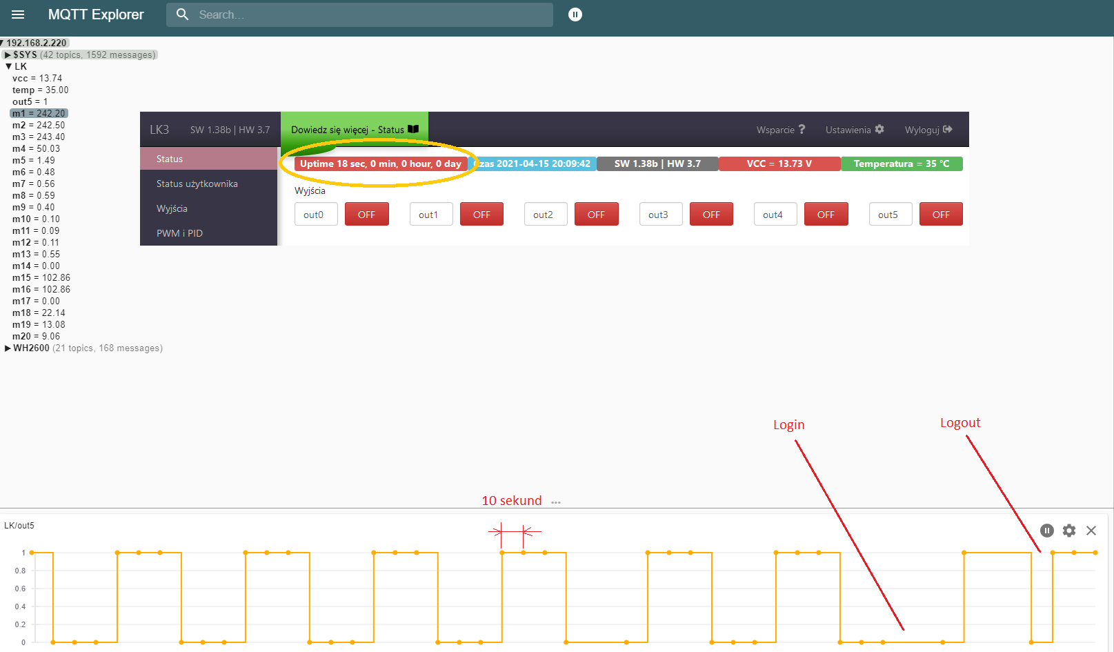 Wcześniej nie zwróciłem na to uwagi ale po dyskusji o możliwości dodania UpTime do elementów wysyłanych przez mqtt próbowałem się temu przyjrzeć i wyszło mi, że zawsze po logowaniu UpTime jest bardzo krótki (kilkadziesiąt sekund).