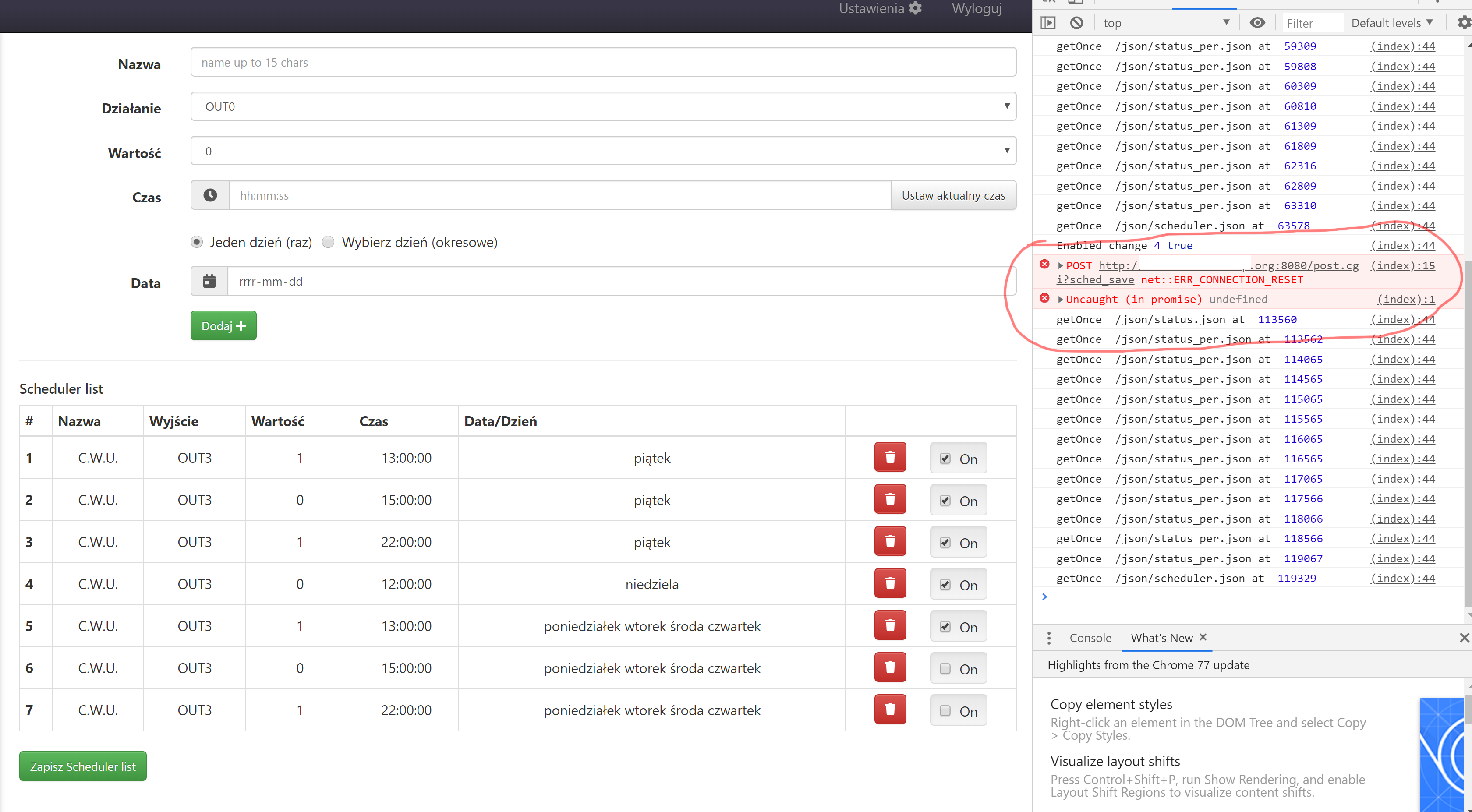 22:00:00 OUT1 wartośc 1 - włącza światło