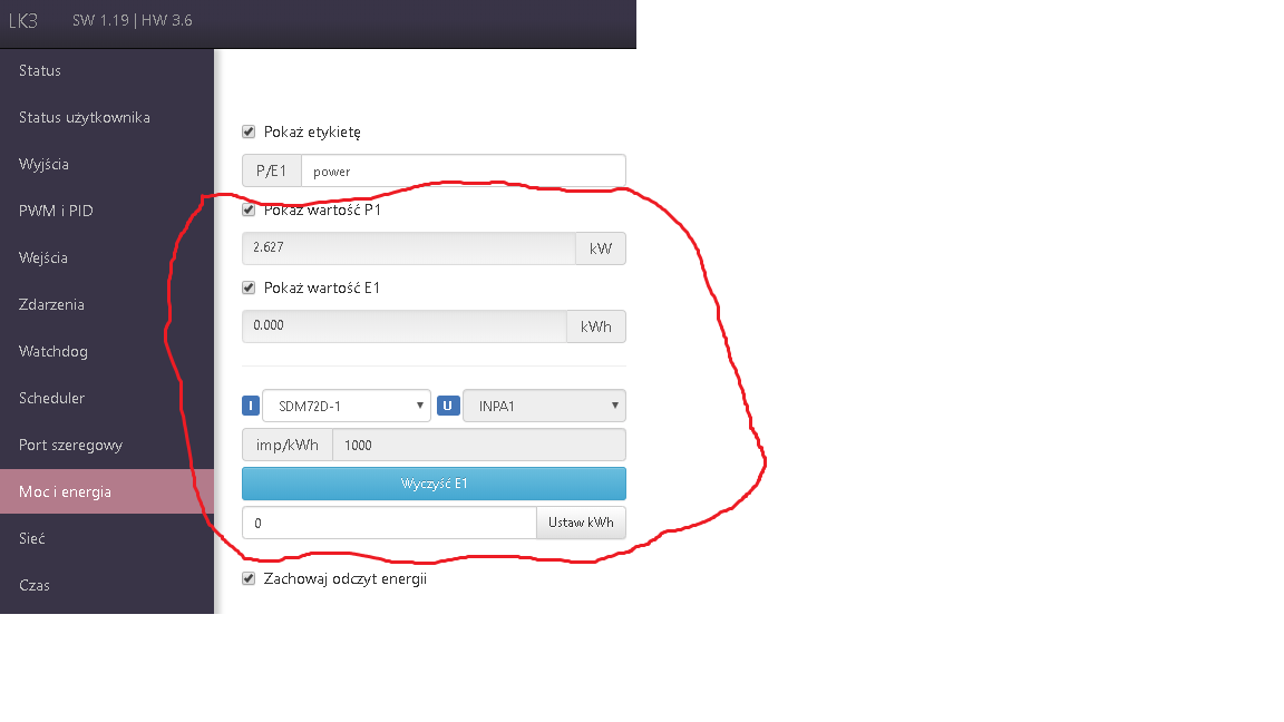 Zakładka Moc i Energia po wybraniu Licznika SDM72D-1 mamy dostępny tylko parametr Pokaż wartość P1. Pokaż wartość E1 wskazuje 0, brak odczytanej wartości z licznika. Mam jeszcze pytanie o Modbus TCP, czy jest szansa na możliwość zmiany stanu wyjść po Modbus TCP