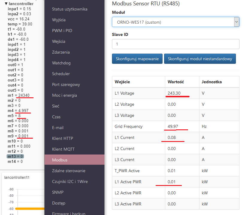 Po skonfigurowaniu modułu niestandardowego i mapowania ze zmiennymi m1..m14 dane z licznika są czytane i wyświetlane poprawnie w oknie Modbus,